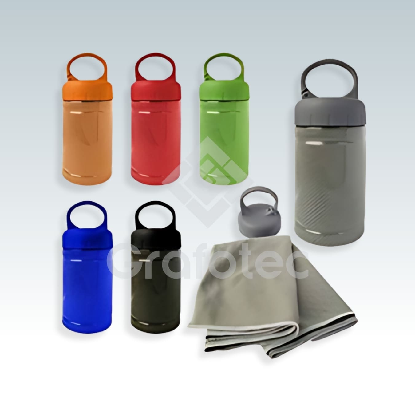 Medidas: Largo: 16 cm. Diámetro: 6.5 cm. Colores de tapa de acuerdo a la toalla colores variados, Envase Acrílico transparente, impresión de logo en serigrafía.